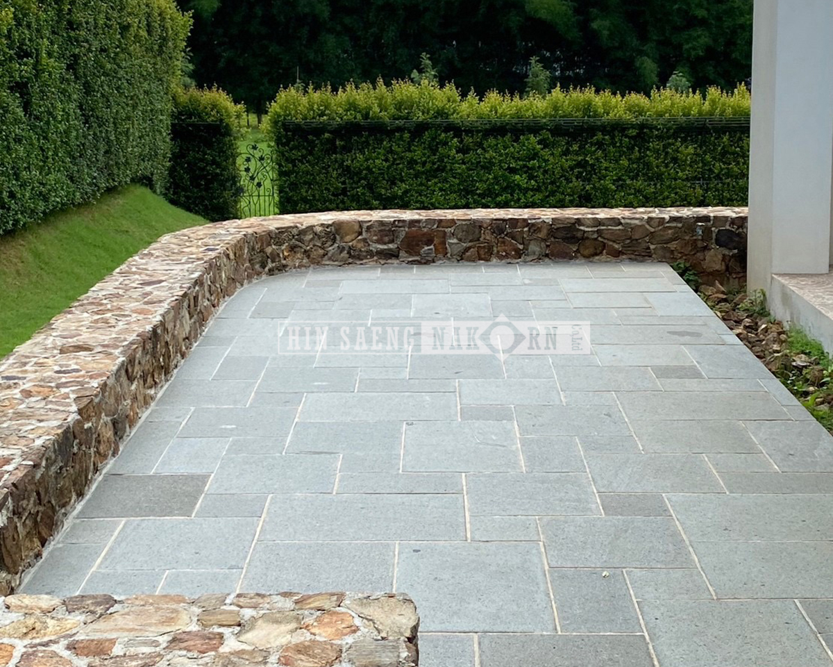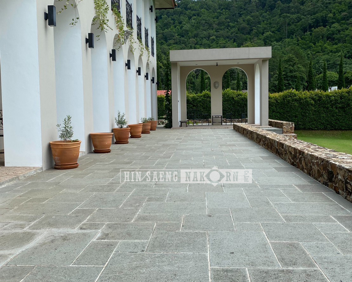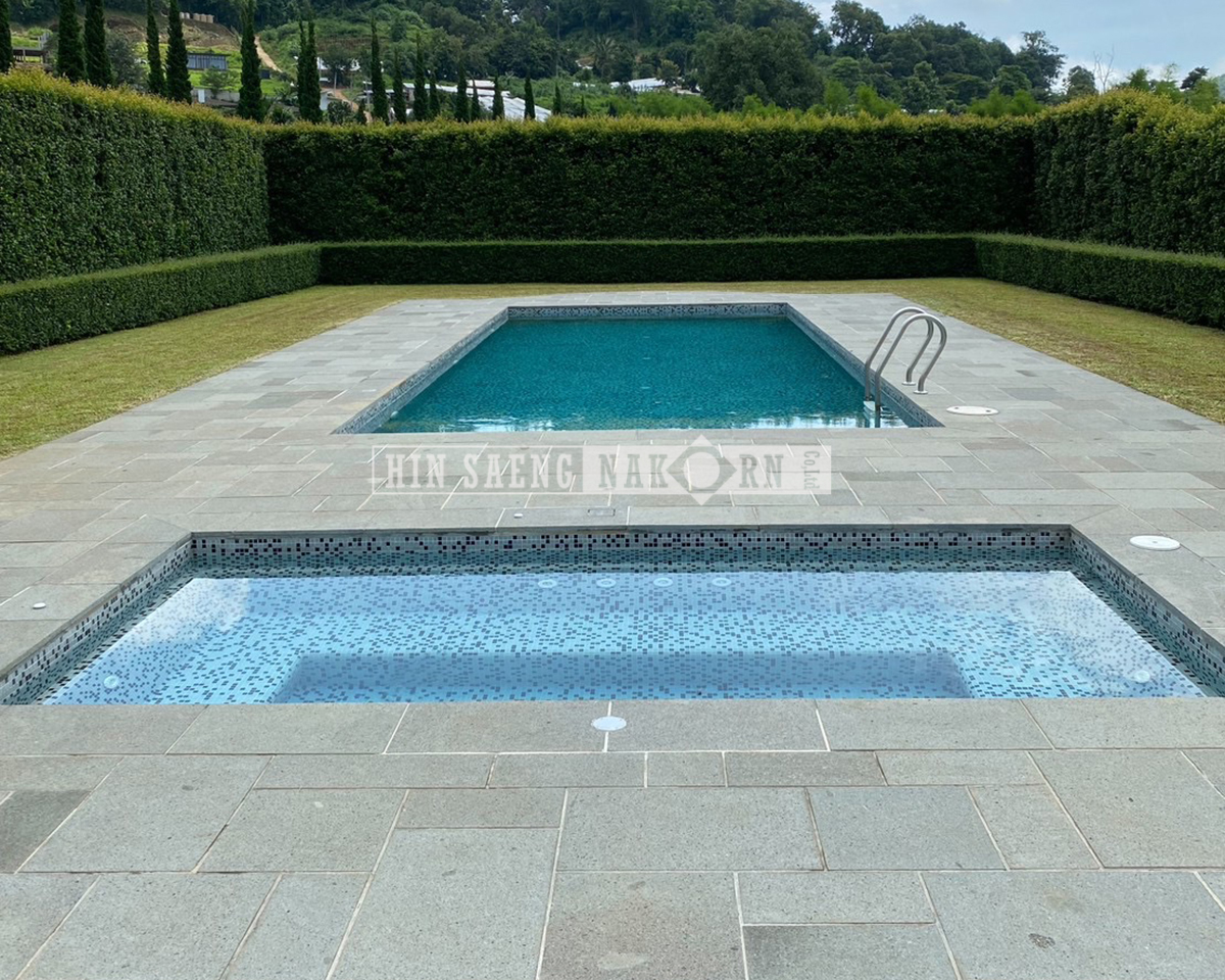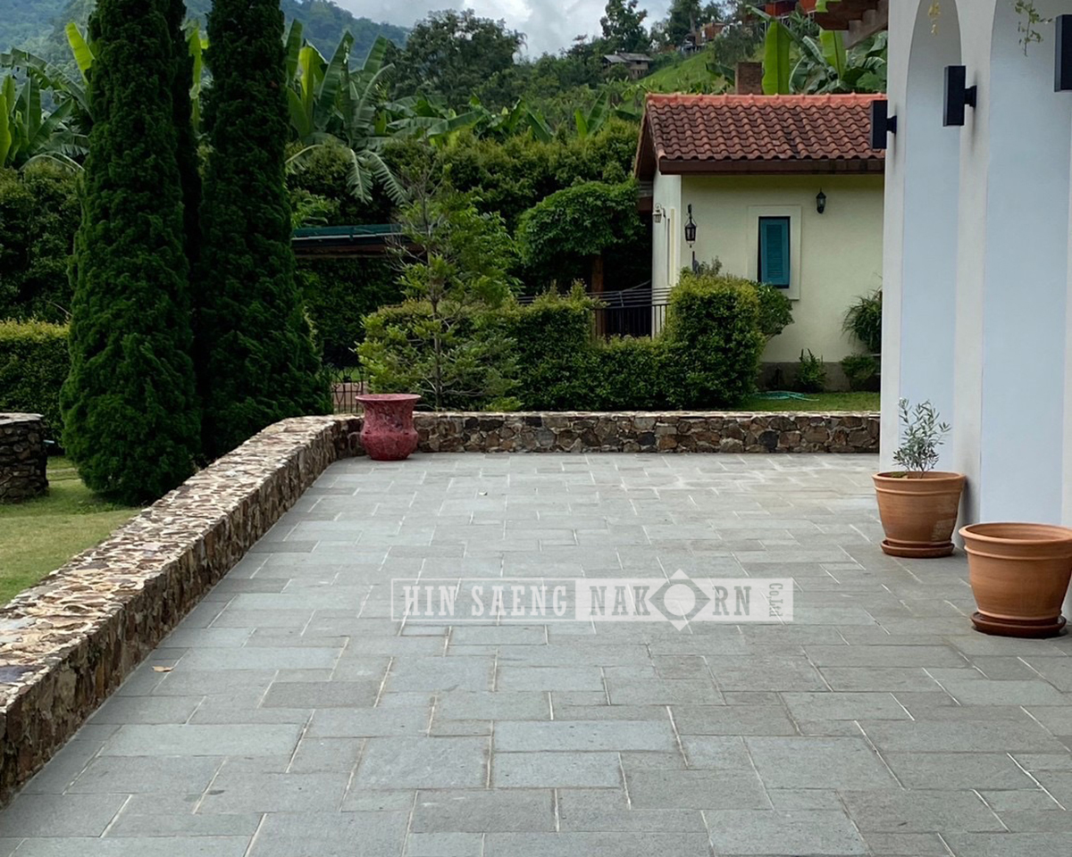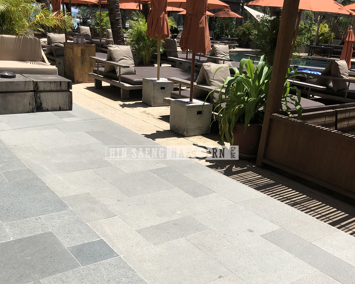 Grey Sukabumi is an andesite with often ample glass in its structure and containing pyroxene (shiny) crystals. Stone was formed in a volcanic process, so it was cooled often fast at low pressures. For this reason contains particles crystallized at depth mixed with glass and fine grained crystals formed near the surface. The glass and very fine grained dust make the stone compact and pretty difficult to split by hand. Porosity and permeability are moderate, but due to its composition the stone is resistant against fungus and mold. Application, often used for drive ways, terraces, cladding, water features and also as swimming pool tiles. Low maintenance is one of the key aspects.