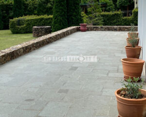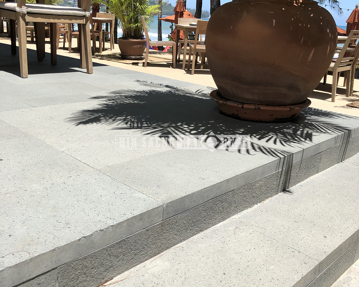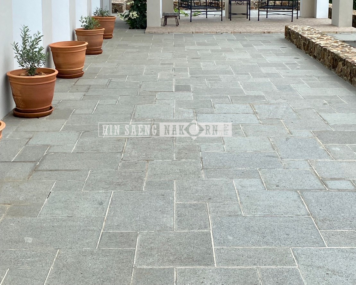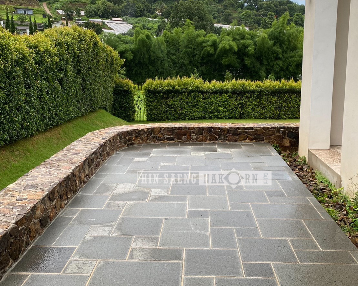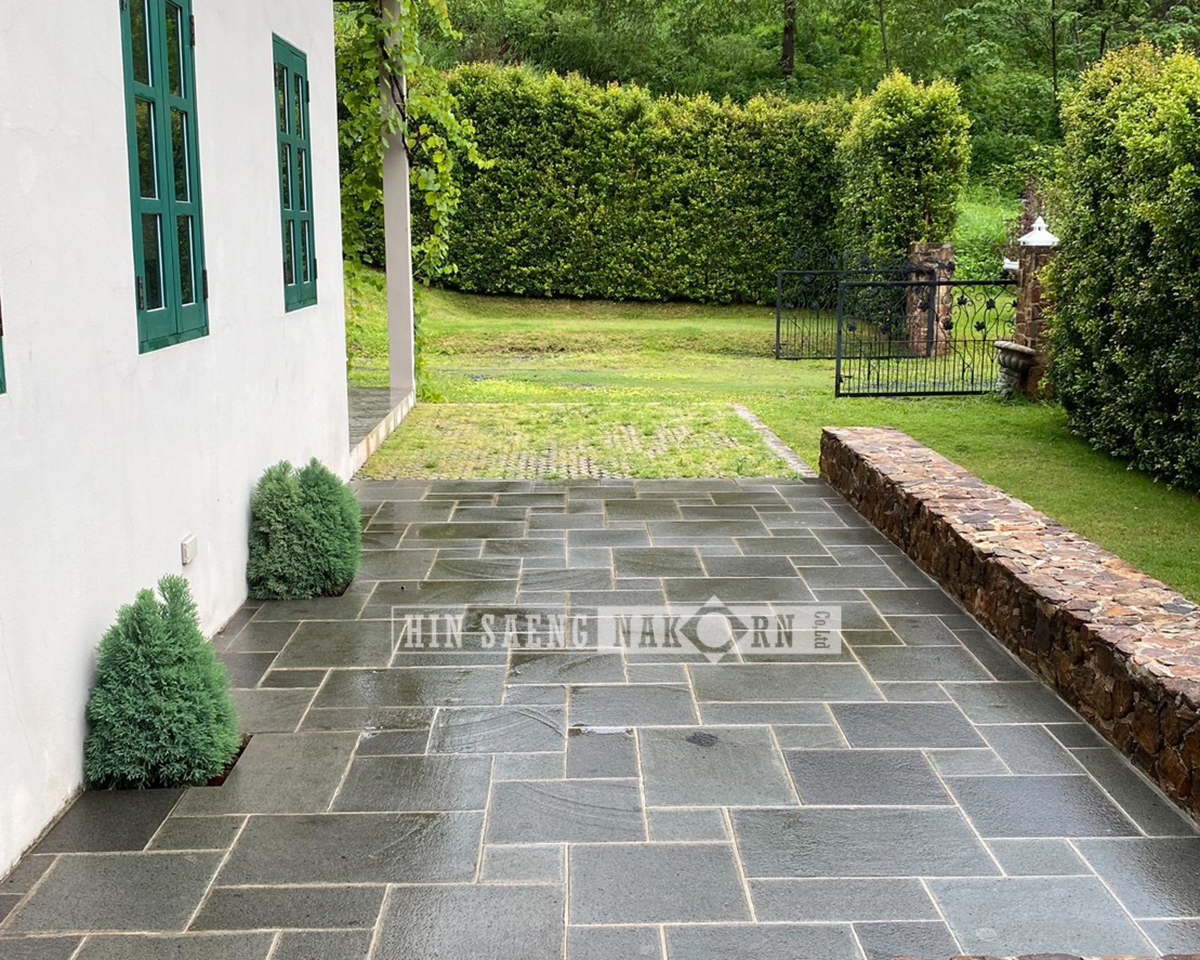 Grey Sukabumi is an andesite with often ample glass in its structure and containing pyroxene (shiny) crystals. Stone was formed in a volcanic process, so it was cooled often fast at low pressures. For this reason contains particles crystallized at depth mixed with glass and fine grained crystals formed near the surface. The glass and very fine grained dust make the stone compact and pretty difficult to split by hand. Porosity and permeability are moderate, but due to its composition the stone is resistant against fungus and mold. Application, often used for drive ways, terraces, cladding, water features and also as swimming pool tiles. Low maintenance is one of the key aspects.