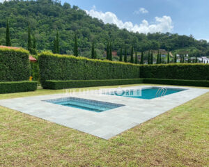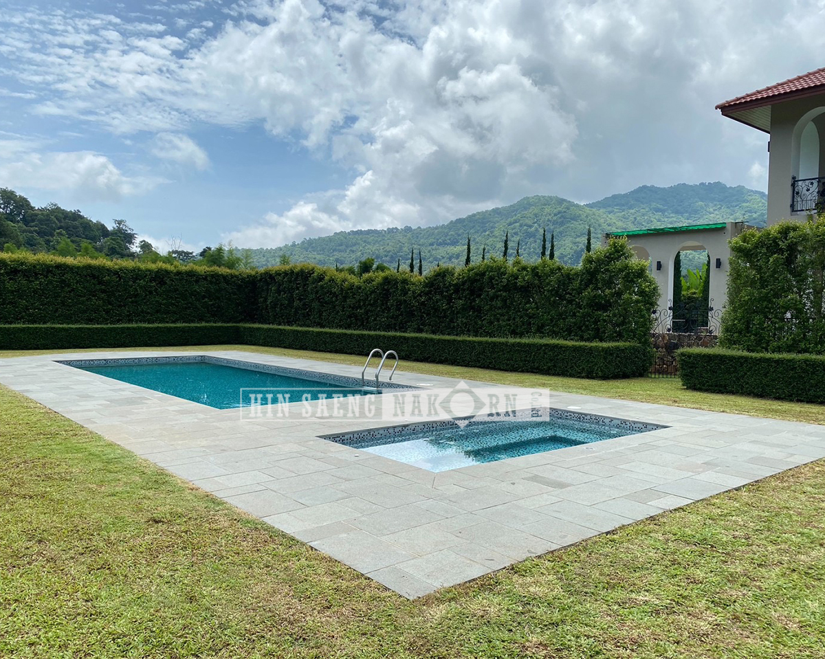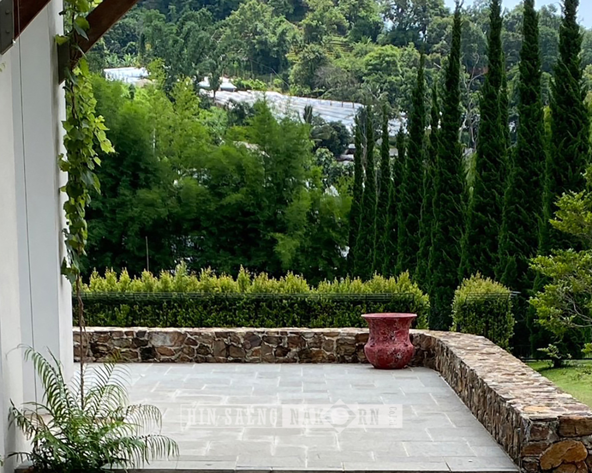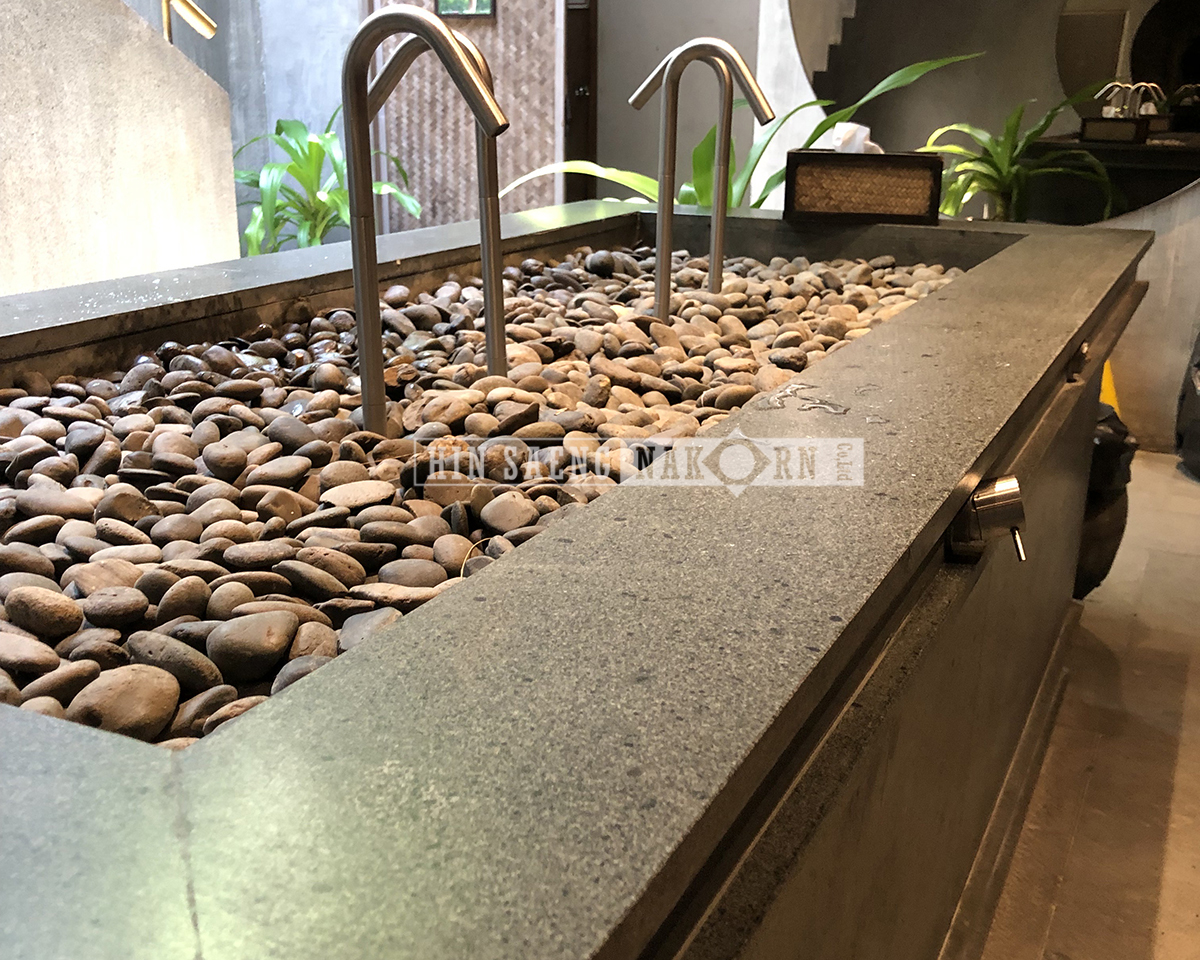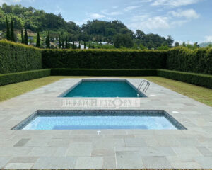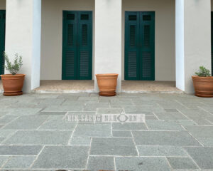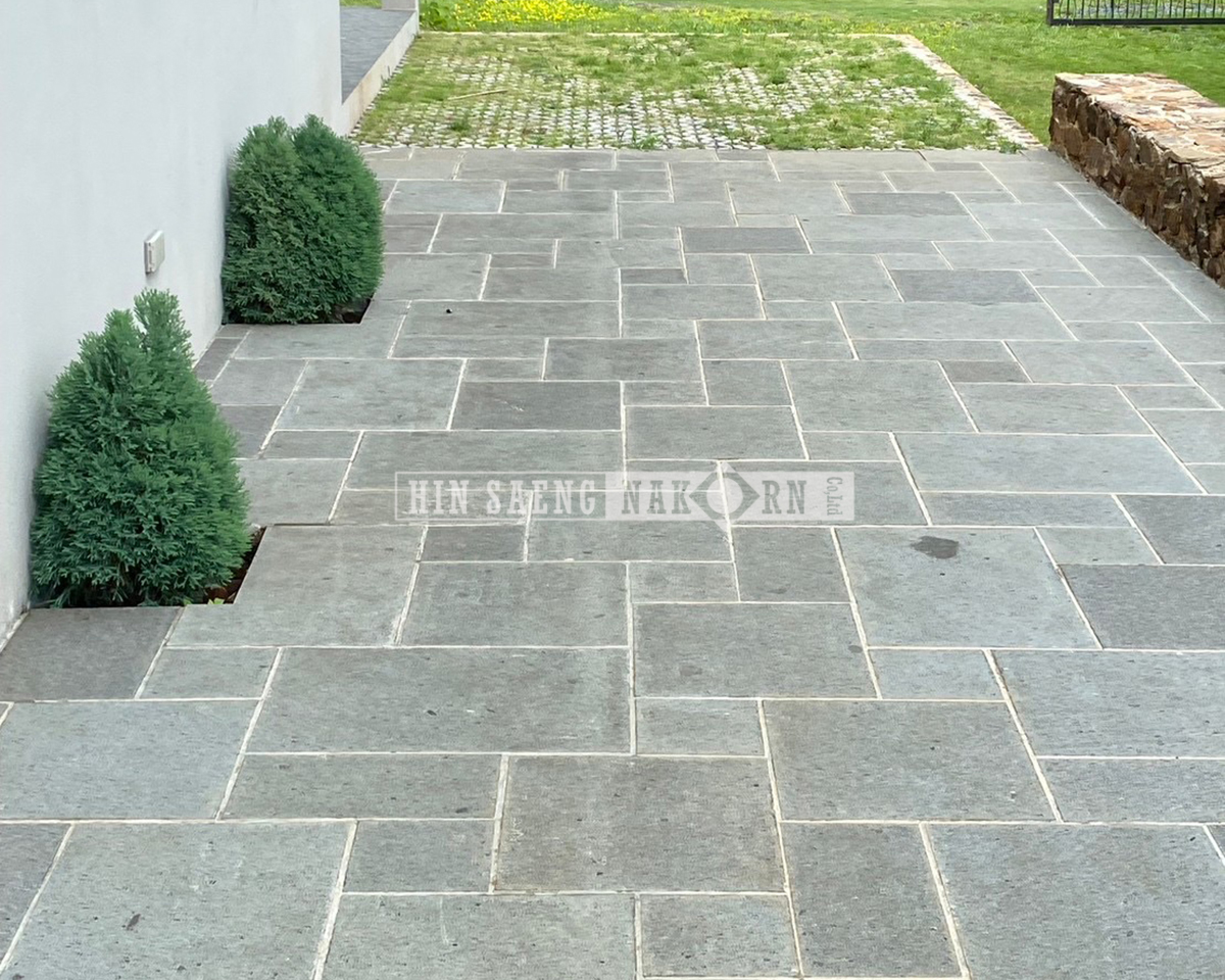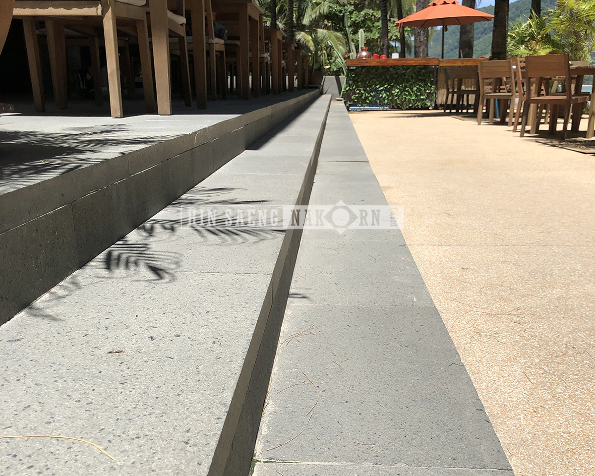 Grey Sukabumi is an andesite with often ample glass in its structure and containing pyroxene (shiny) crystals. Stone was formed in a volcanic process, so it was cooled often fast at low pressures. For this reason contains particles crystallized at depth mixed with glass and fine grained crystals formed near the surface. The glass and very fine grained dust make the stone compact and pretty difficult to split by hand. Porosity and permeability are moderate, but due to its composition the stone is resistant against fungus and mold. Application, often used for drive ways, terraces, cladding, water features and also as swimming pool tiles. Low maintenance is one of the key aspects.
